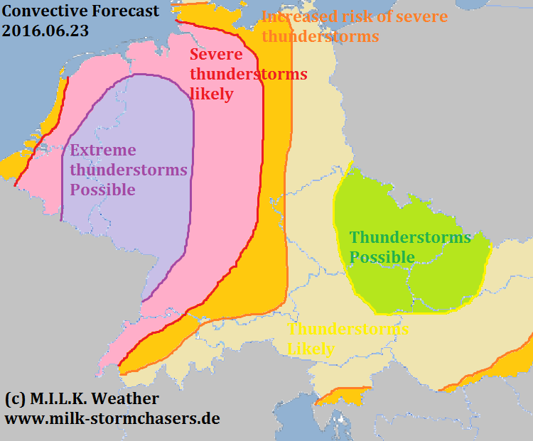 Because of the possibility of a very dangerous severe weather situation in central Europe today, M.I.L.K. decided to issue a convective forecast. The main risks in today's thunderstorms are storm gusts, large hail and, to a lesser extent, tornadoes. Below is the M.I.L.K. Weather convective forecast.